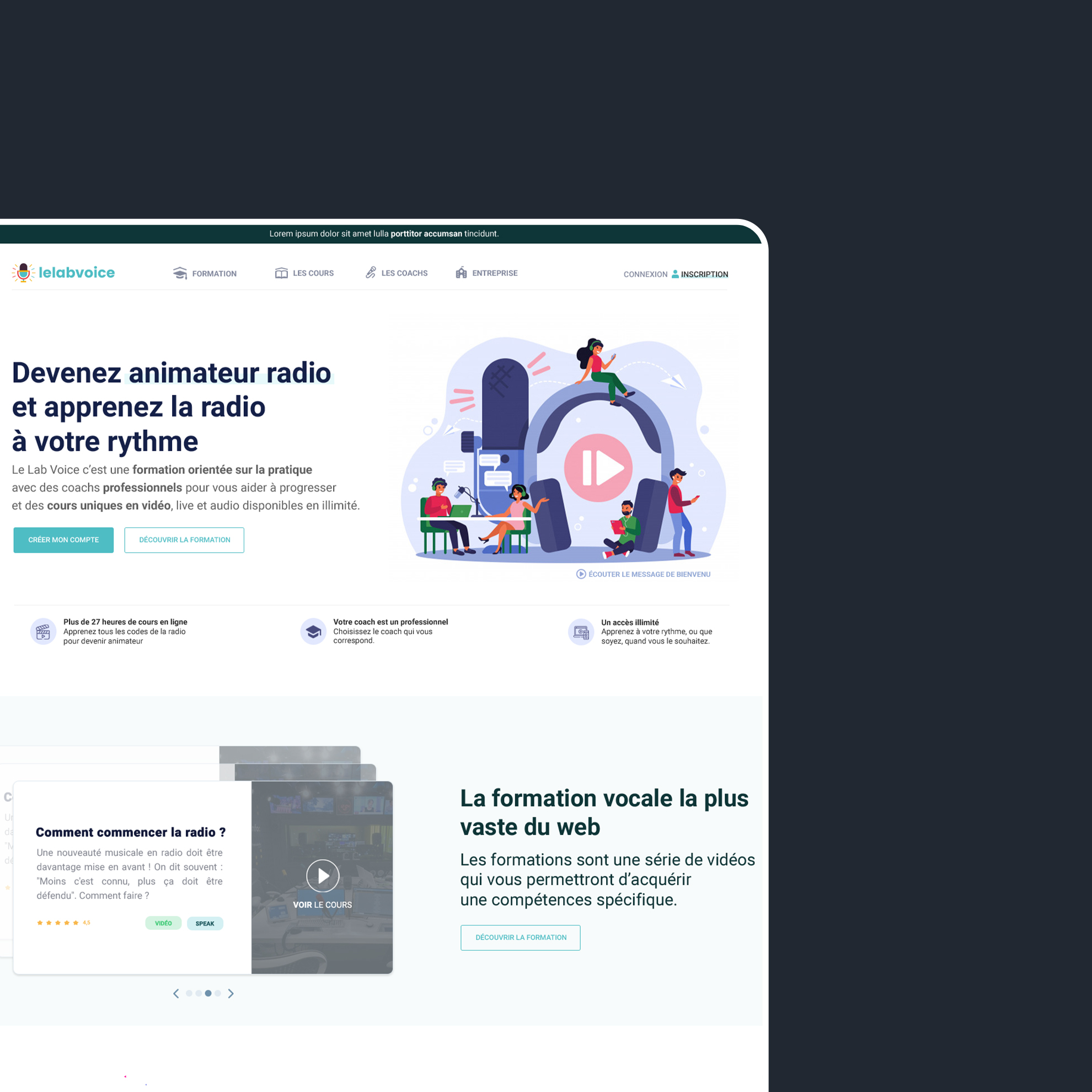 Une formation radio en ligne unique de 70 vidéos, plus de 6 heures de contenus et 6 coachs face à vous. Vous apprendrez toutes les techniques pour devenir un animateur radio, webradio et podcast.